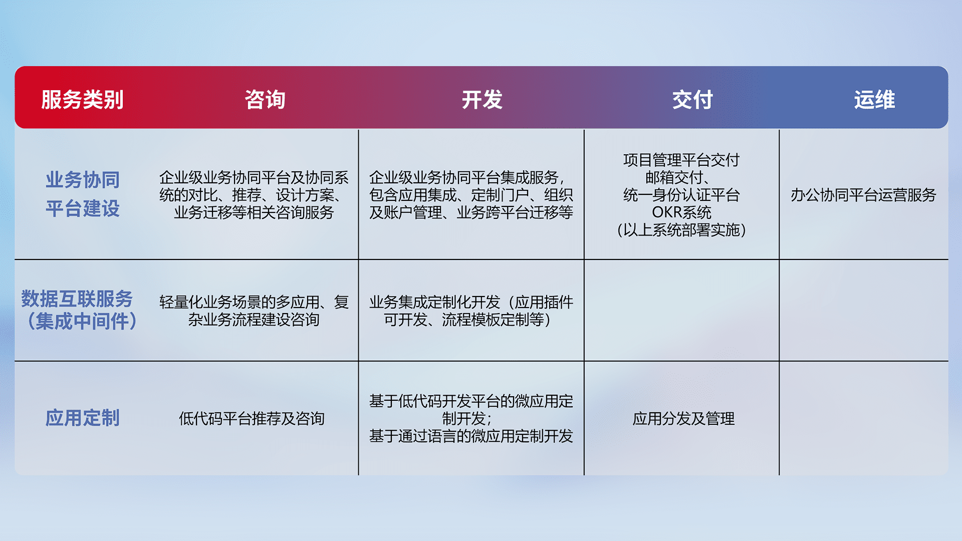 针对钉钉、、、、企微、、IDaas等平台级产品提供产品的规划、、、方案、、、交付、、定制化开发等服务,,,,实现如统一协同办公、、智能客户服务、、、混合会议管理、、智能数据查询、、、等业务场景,,,实现数字化转型。。。。