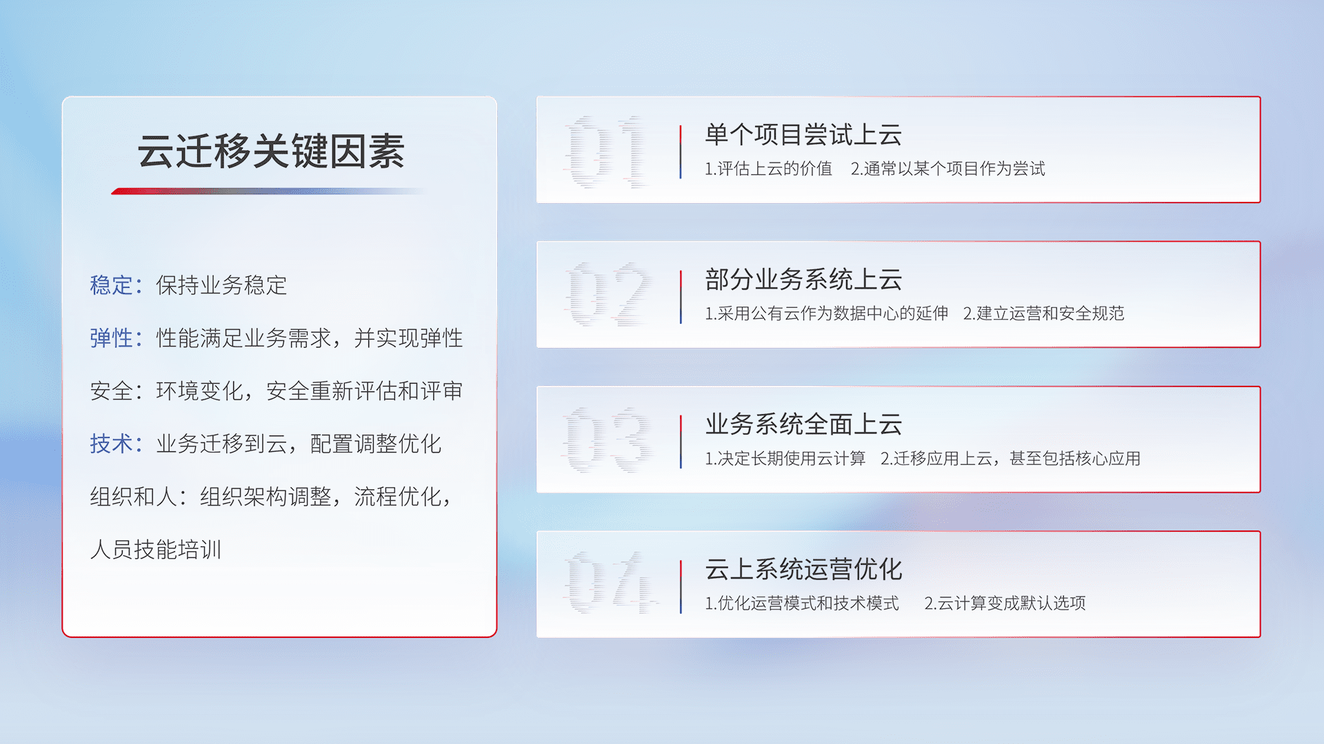 结合实际业务,,,从规划设计、、、、云平台选型、、云原生改造、、、、数据迁移、、、、集成交付,,,,迁移全过程为客户识别最佳上云路径,,,做好风险识别管理,,,,设计网络架构、、、、身份权限、、、、安全审计合规、、操作审计、、、日志审计、、、、监控告警策略、、多站点容灾设计等,,,对云上基础设施进行整体规划,,,提升IT治理水平,,以满足弹性、、、、高可用、、、、高性能的需求。。